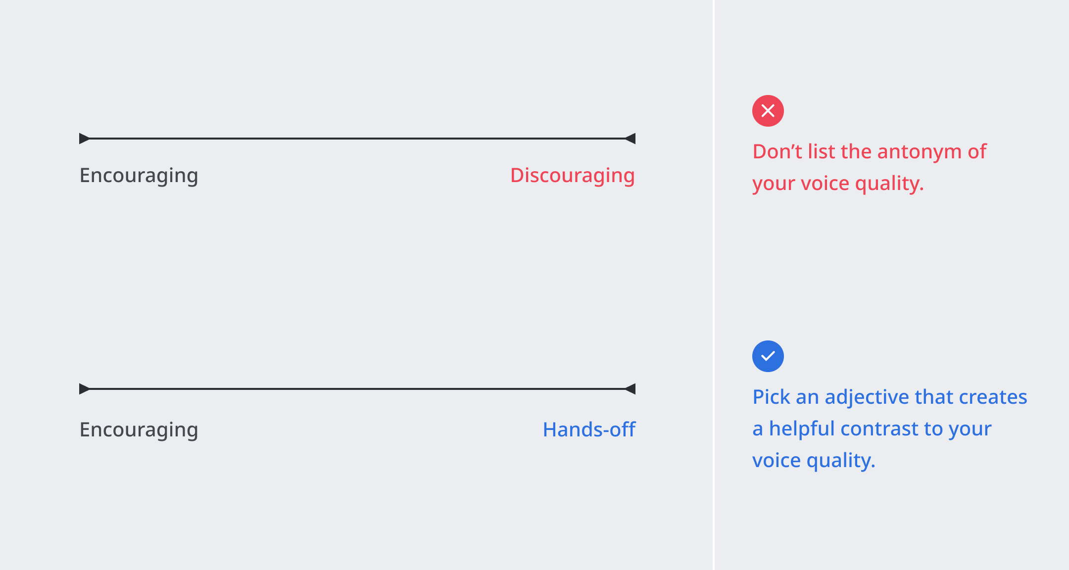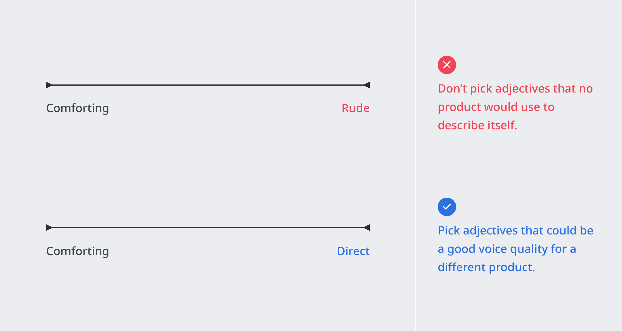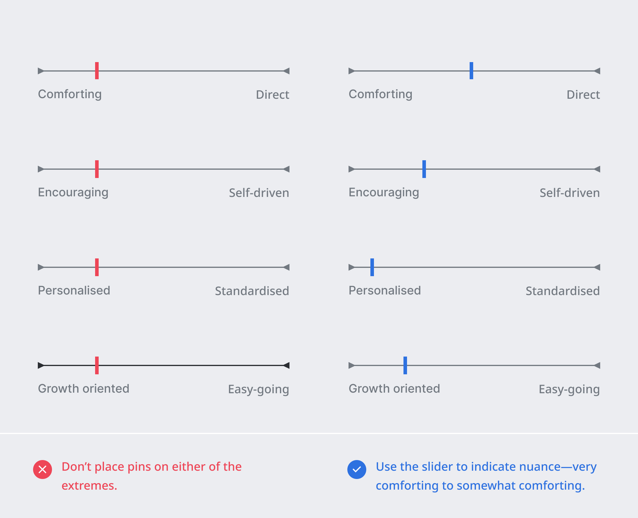 > Your product may not always be encouraging or comforting. Place pins on the spectrum to capture nuance in your product’s voice quality.