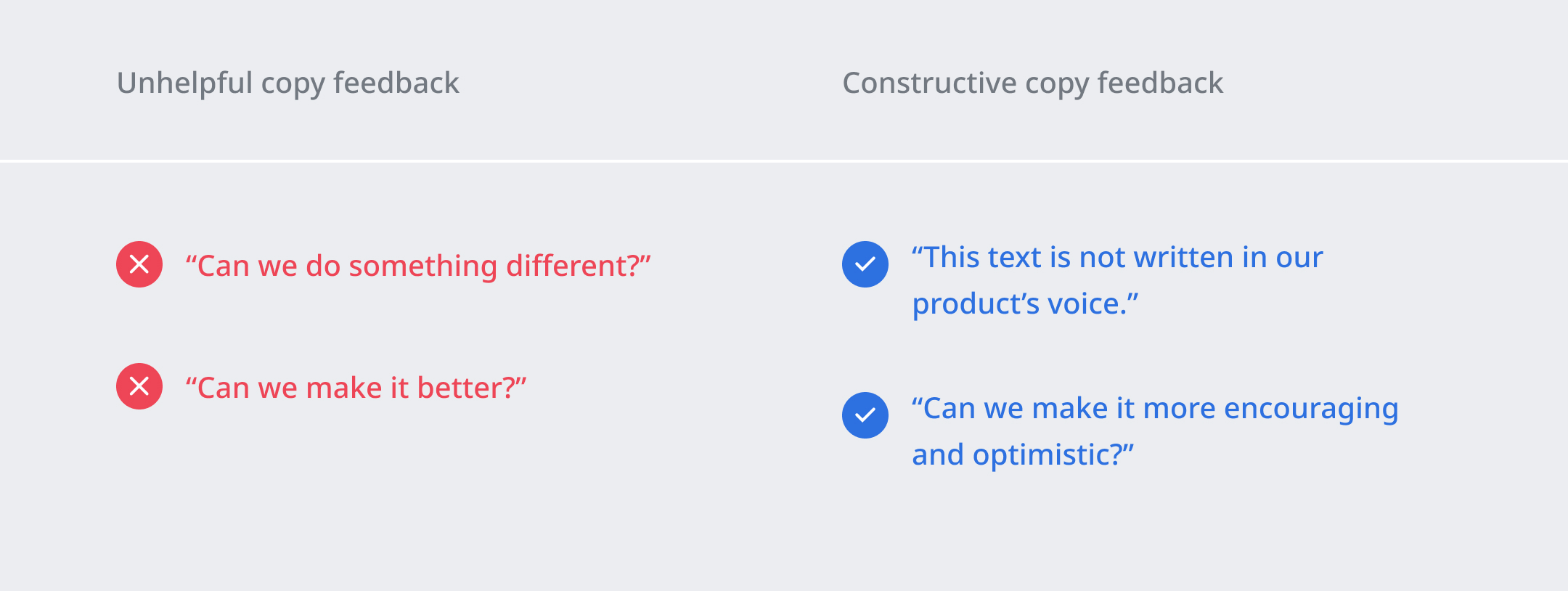 > **Use it for feedback.** Use the voice guidelines as a common vocabulary.