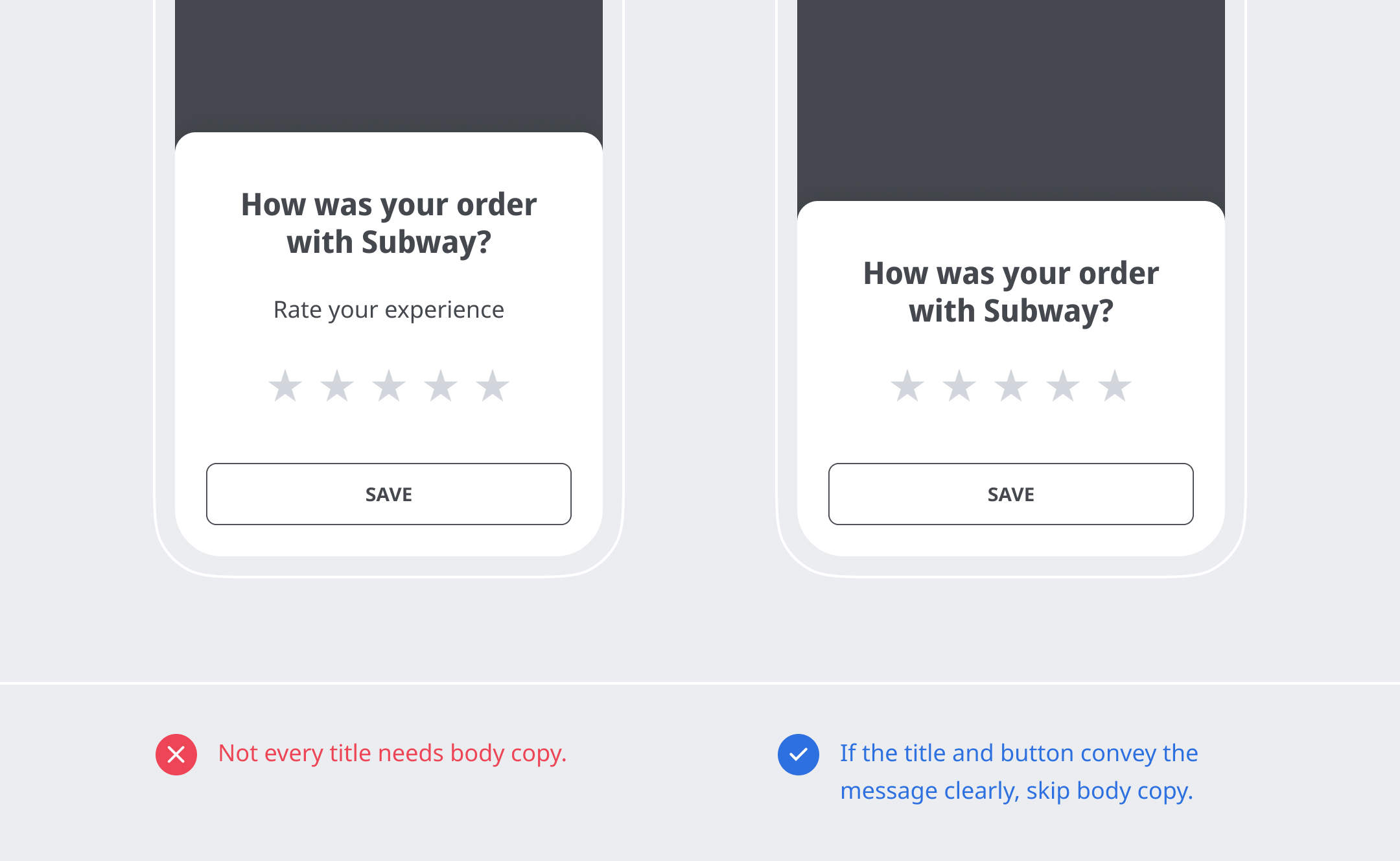 Be clear—The dialog box is used for alerts or confirmations. In the title, speak about the action the user will take.