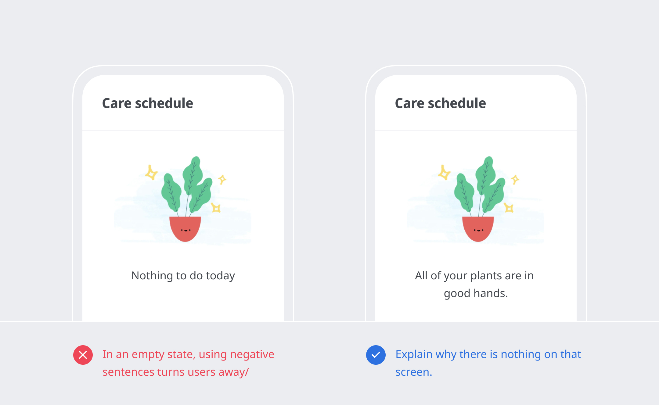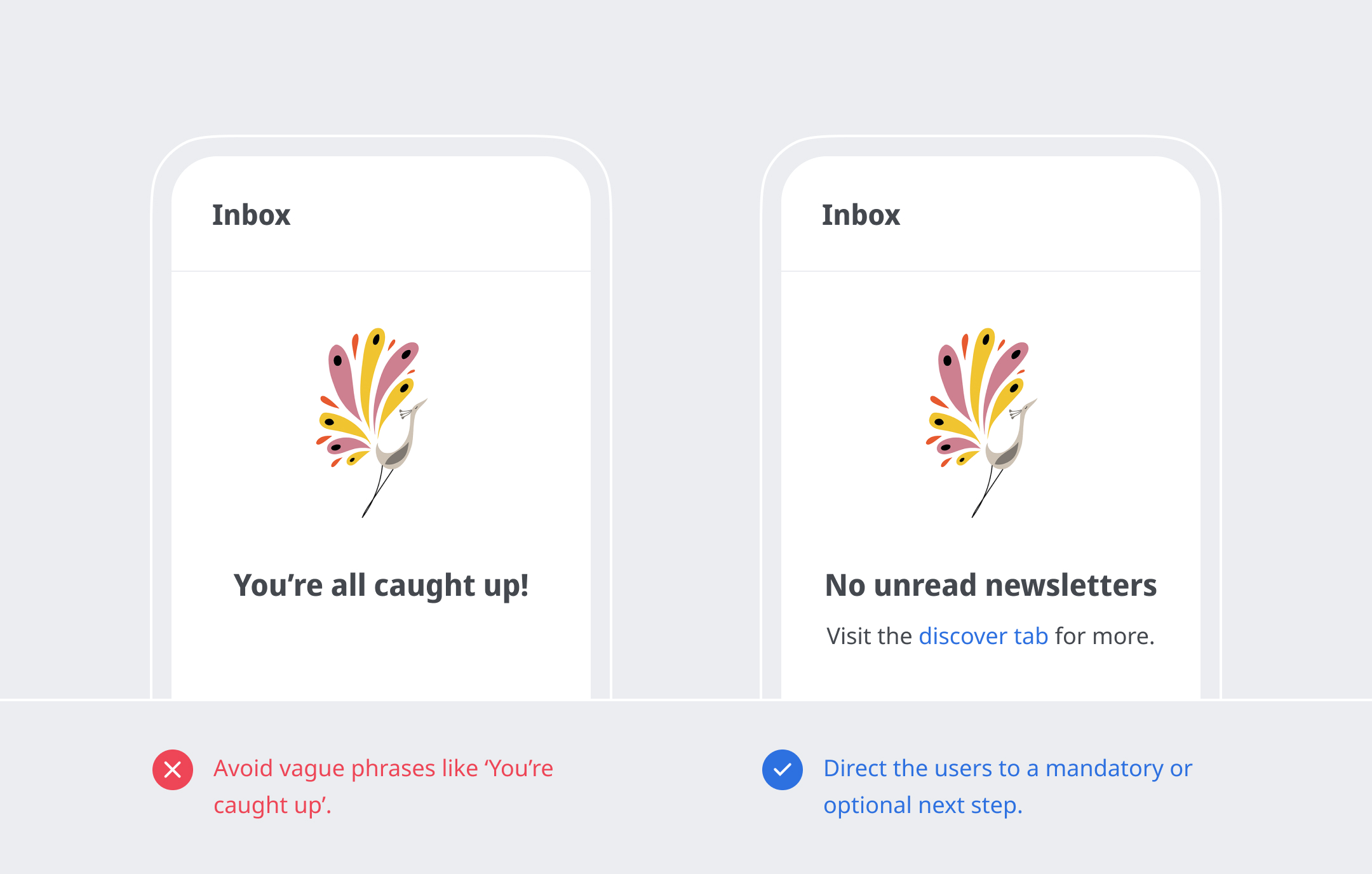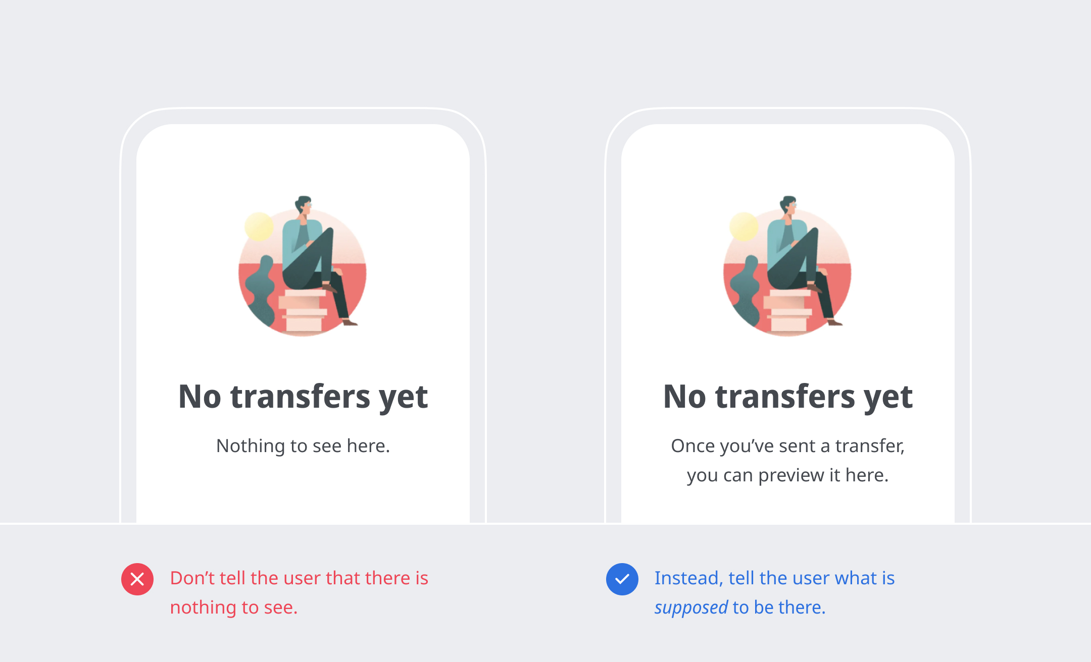 Tell the user what is supposed to be there—If a user has never used a feature and lands on an empty page, it will turn them away,