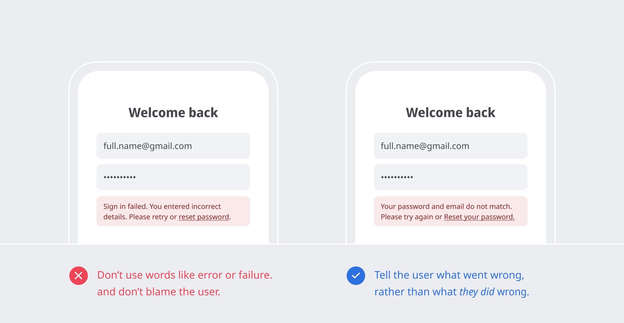 Make it human—Rewrite the error message to reinforce the brand’s personality and to speak like a human.