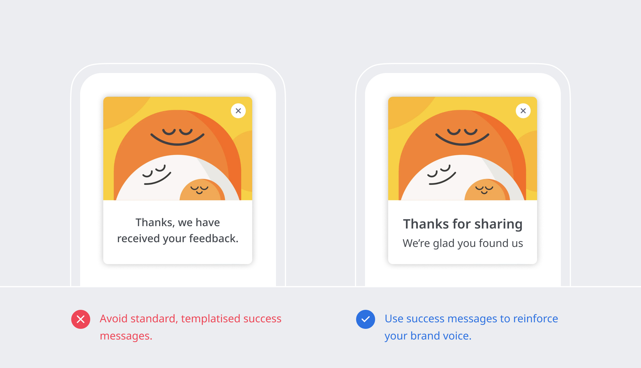 Go beyond the template—Do not use a template “x successfully completed” message for every time. Speak to your user with warmth.