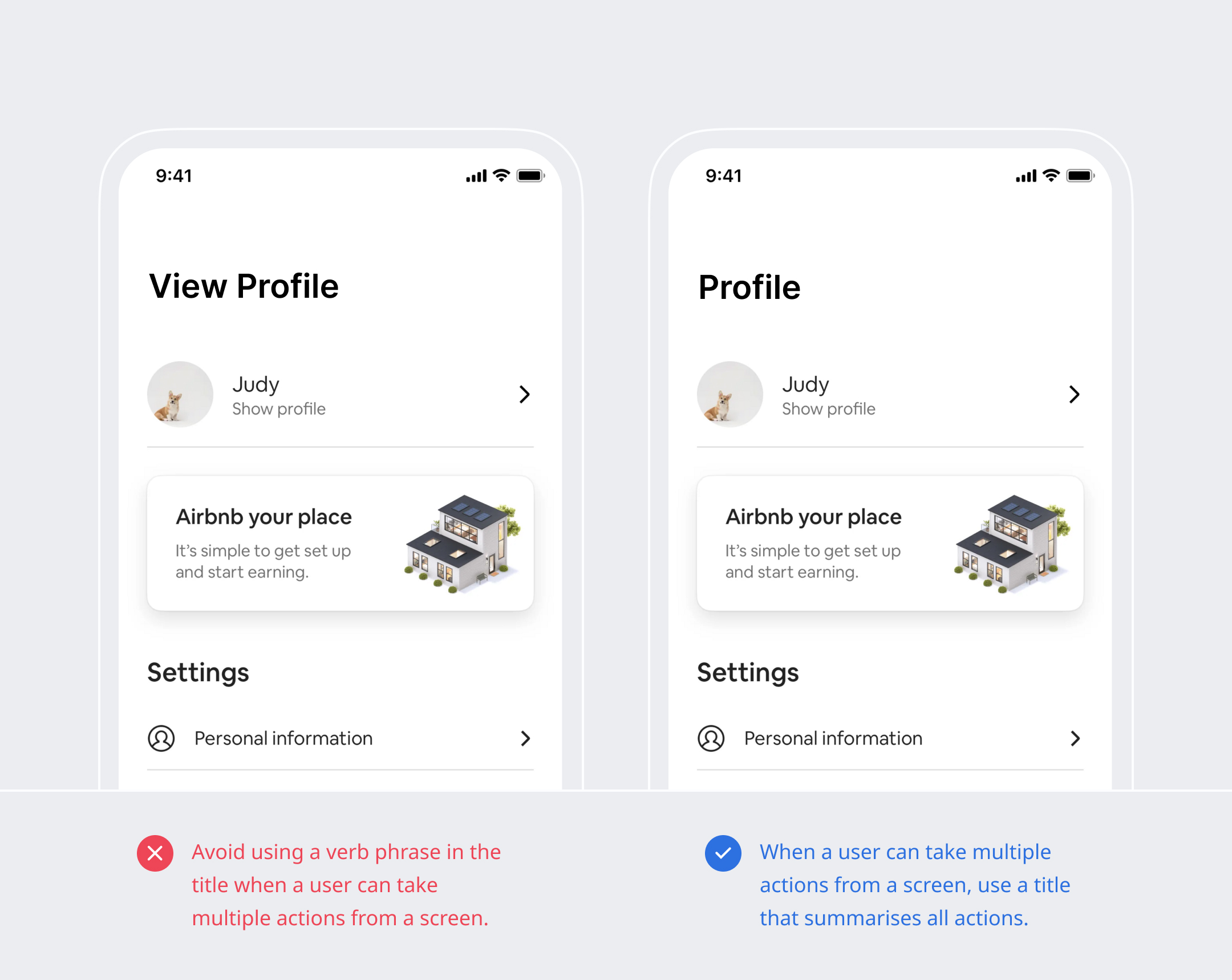 Summarise actions—When there are many actions for a user to take, the title should summarise all actions. These titles are often ambiguous. They can be a noun phrase or a verb phrase.
