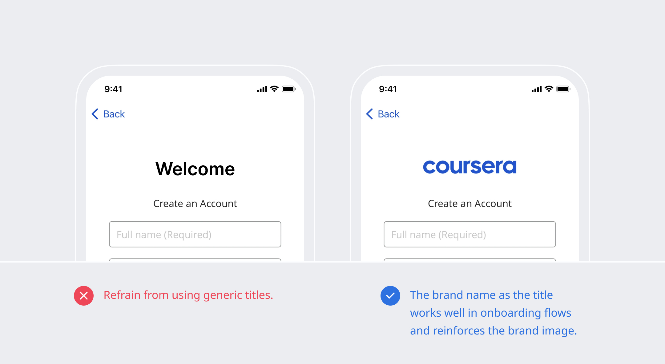 Content as title—When the screen is based on content like an FAQ or a blog post, use the title of the content.