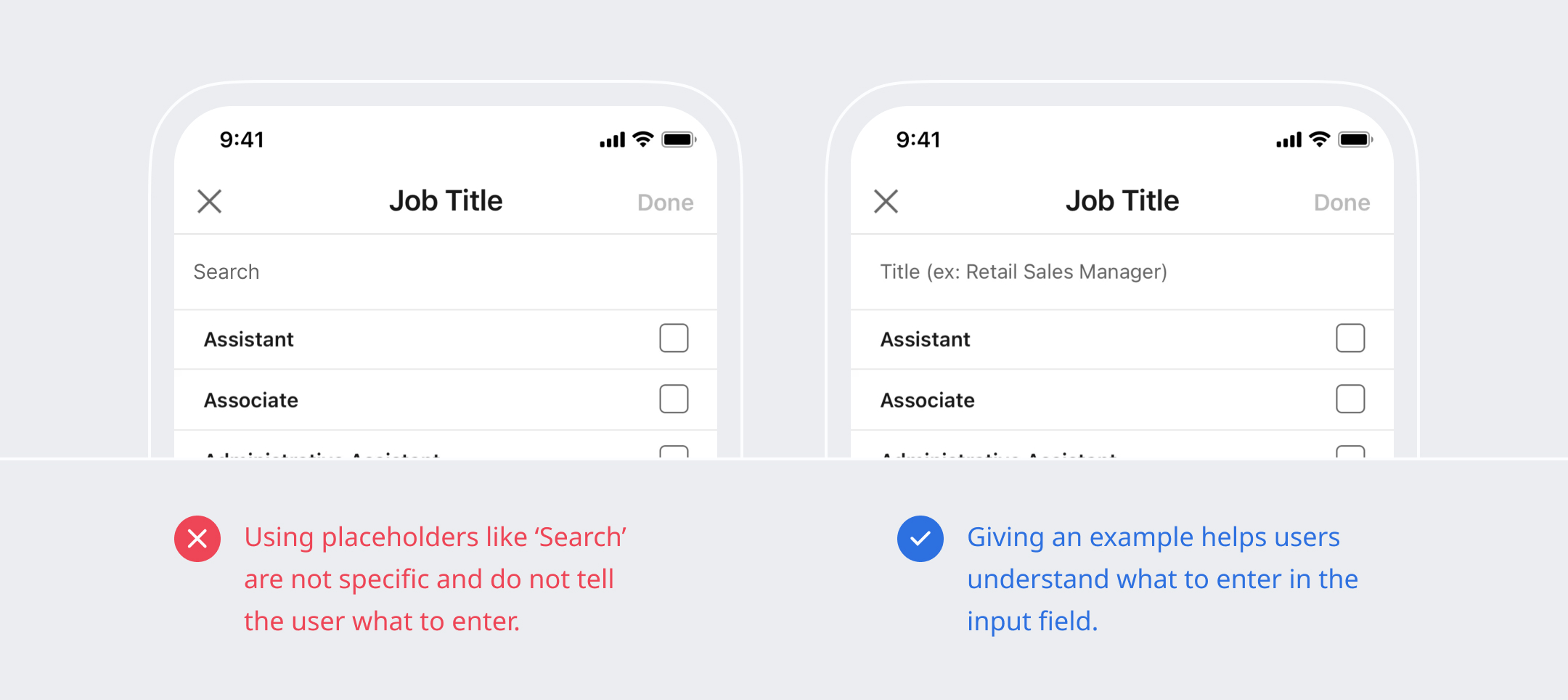 Input fields appear when the user has to enter information or run a search. The placeholder text appears inside the input field and helps the user enter accurate information. You can write different kinds of placeholder text: