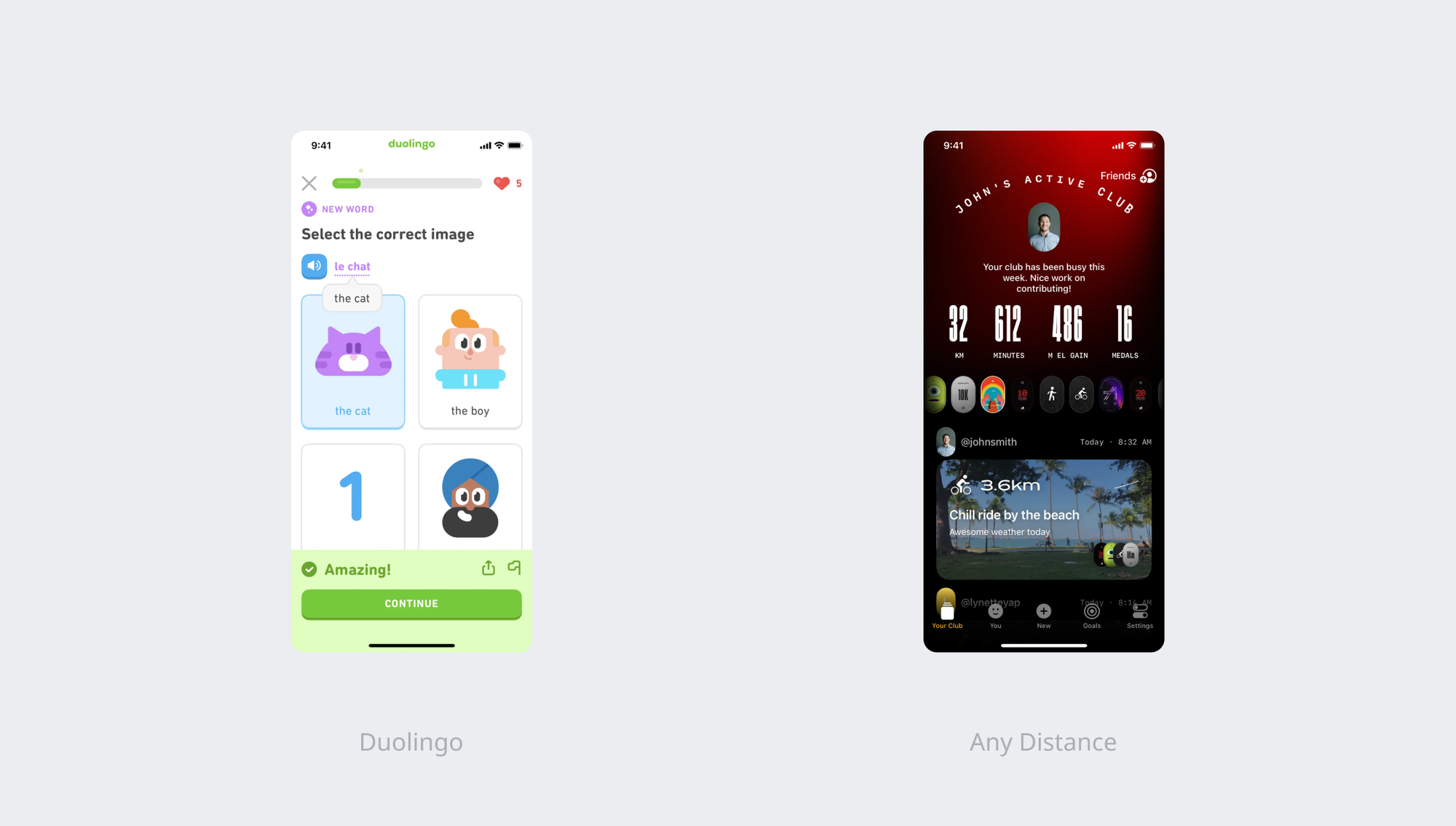 > Apps like Duolingo use playful typefaces because they come off as a friendly educational app. On the other hand, apps like Any Distance use bold & strong typefaces since they want to come off as a bold fitness app.
