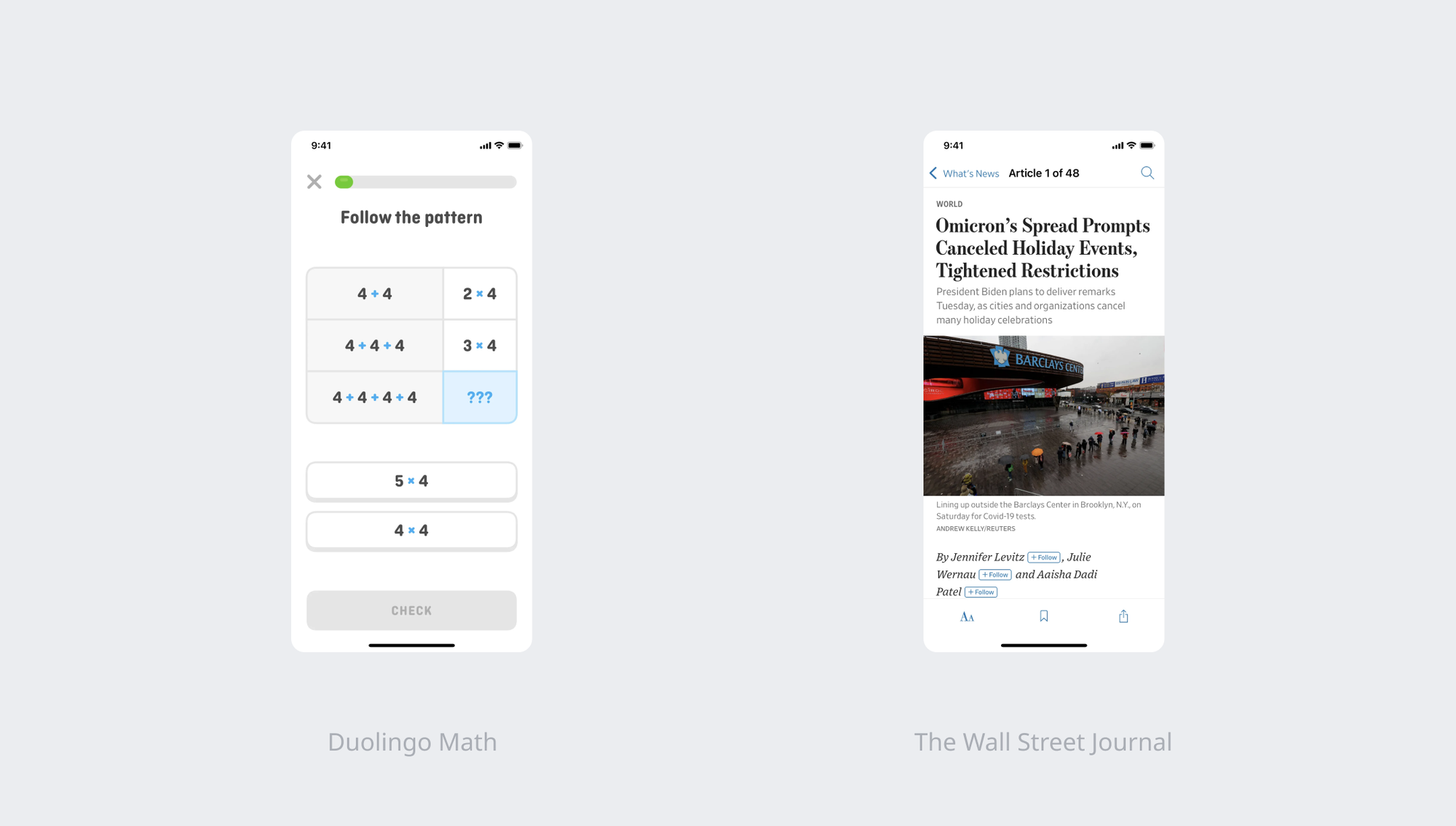 > Apps like Duolingo Math use playful typefaces because they are mostly targeted for the kids. On the other hand, The Wall Street Journal, which has a wide readership across ages, uses classic typefaces.