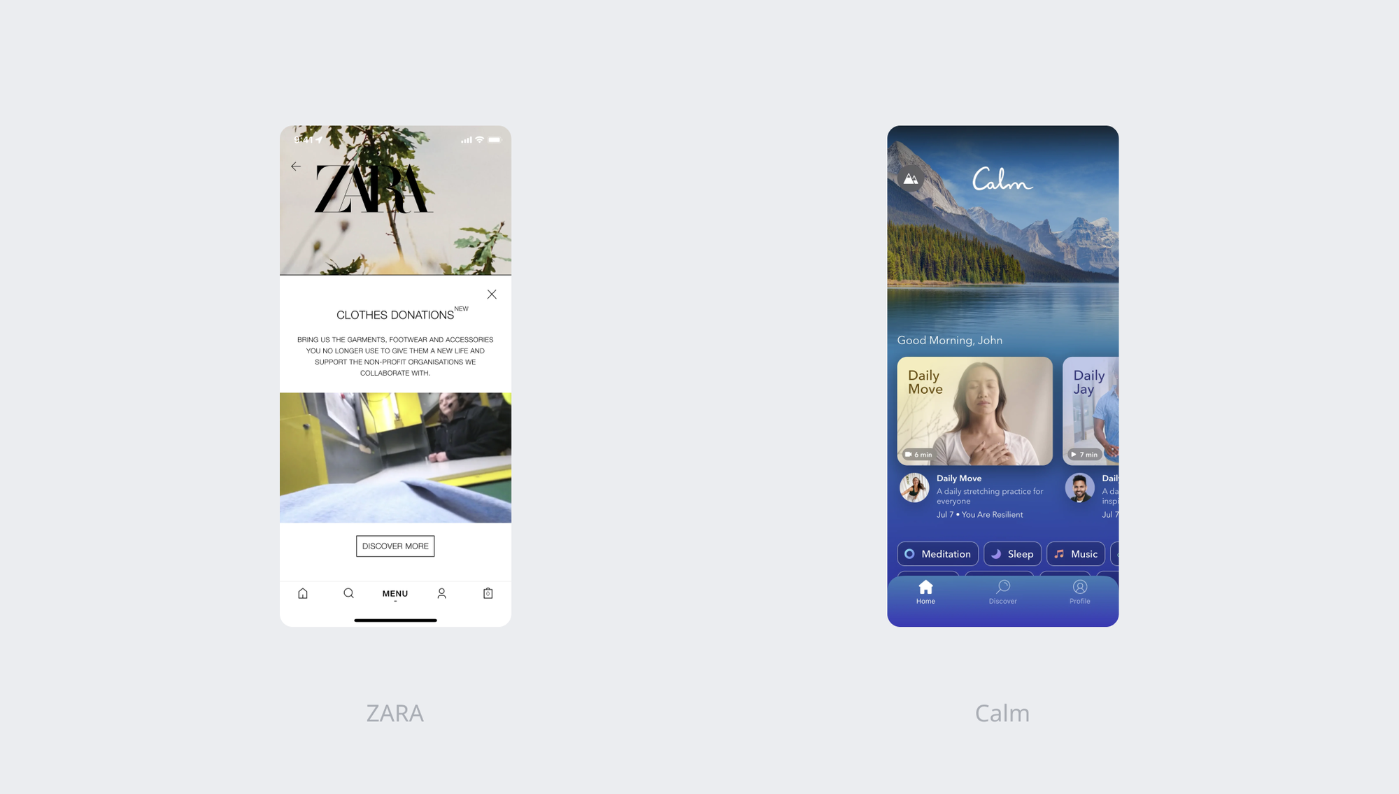 > Apps like Zara use luxury typefaces because they market themselves as a luxury product. On the other hand, apps like Calm uses modern typefaces since they market themselves as a mental wellness product.